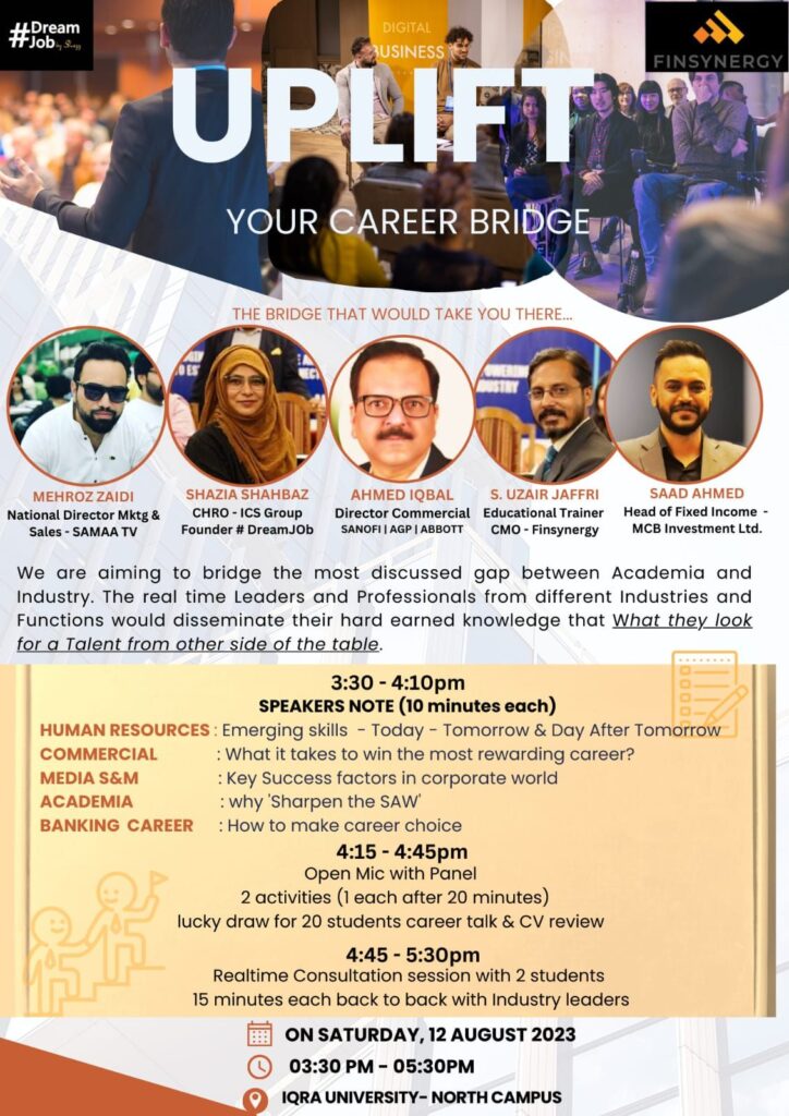 Finsynergy Co. is organizing a thought provoking session in collaboration with #DreamJob by Shazz and Iqra University – North Campus, where Industry and Academia Specialists will be mentoring the students to Uplift Your Career.